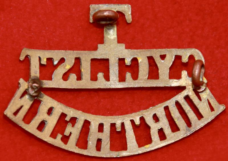 A brass shoulder title for The Northern Cyclits with two lug fastenings (north and east as viewed from the rear - the west lug is missing). Westlake 1577.