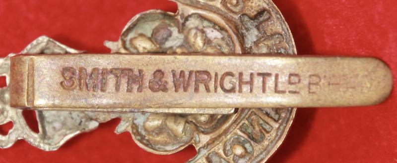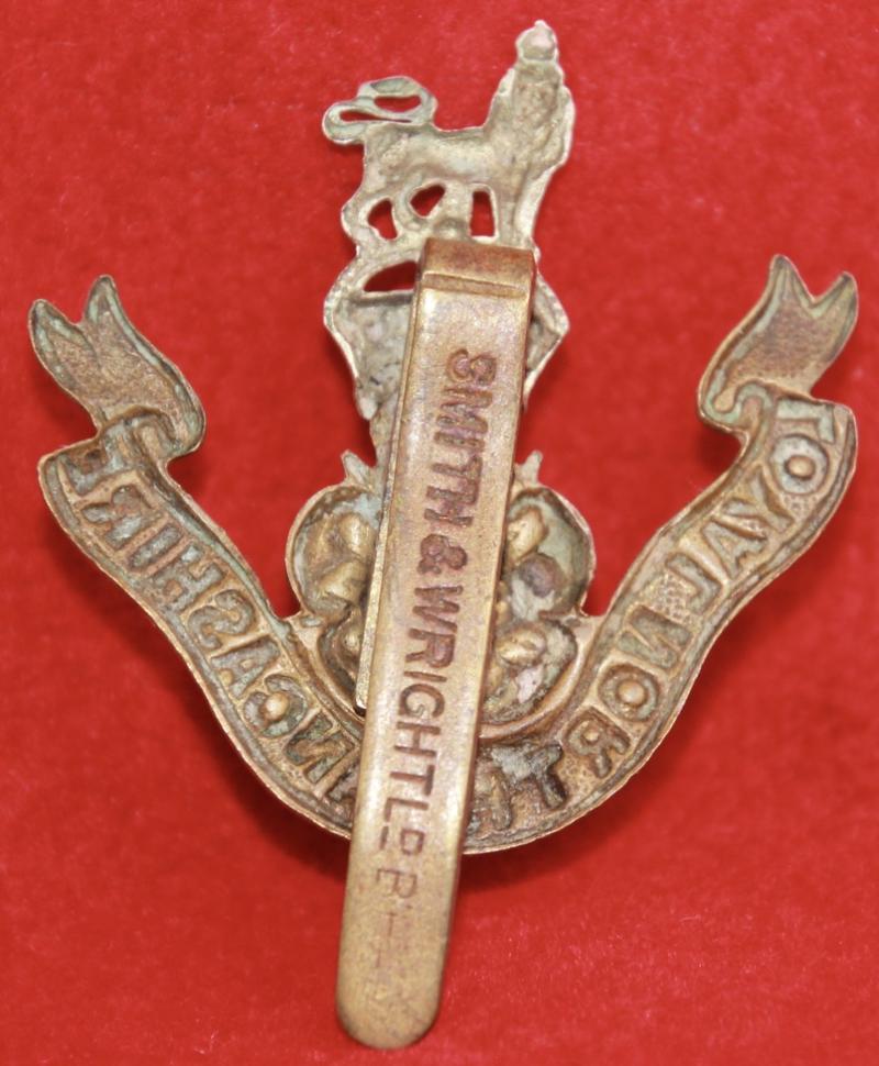 A bi-metal cap badge for The Loyal North Lancashire Regiment with a slider fastening (marked Smith & Wright Ld B'ham - the mark fading towards the end). KK664.