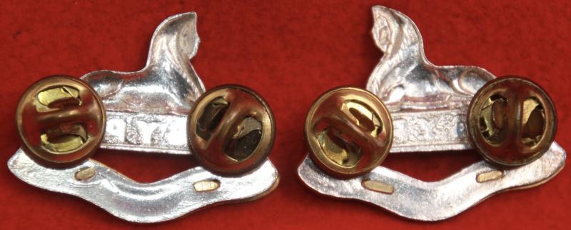 A nice pair of silver-plated and gilt collar badges for an officer of the 2nd battalion of The East Anglia/Royal Anglian Regiment, each with two clutch and pin fastenings (east and west). Churchill & Westlake 284.