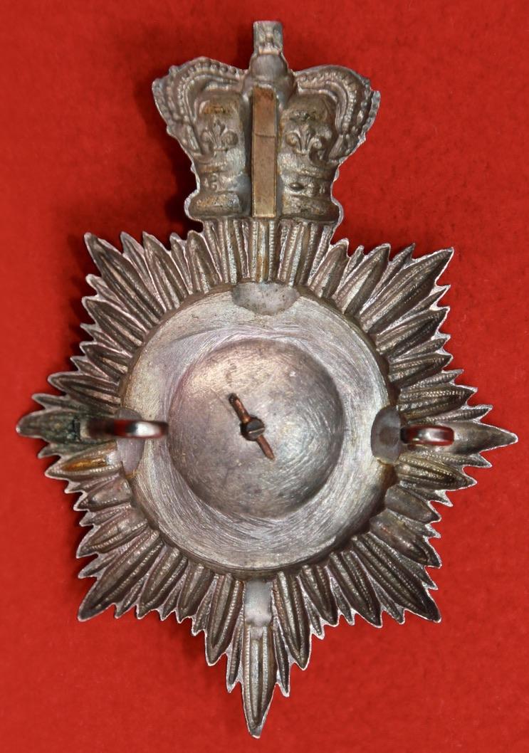 A rare, silvered, shako plate with two lug fastenings (east and west) and a support to the back of the crown. It appears to have a purple cloth backing to the centre. Approximately 55mm wide x 75mm high.