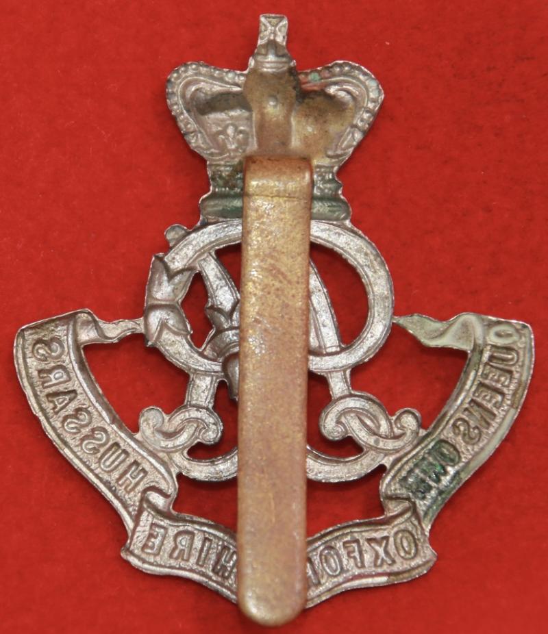 A white metal cap badge for The Queen's Own Oxfordshire Hussars with a slider fastening. KK1462.