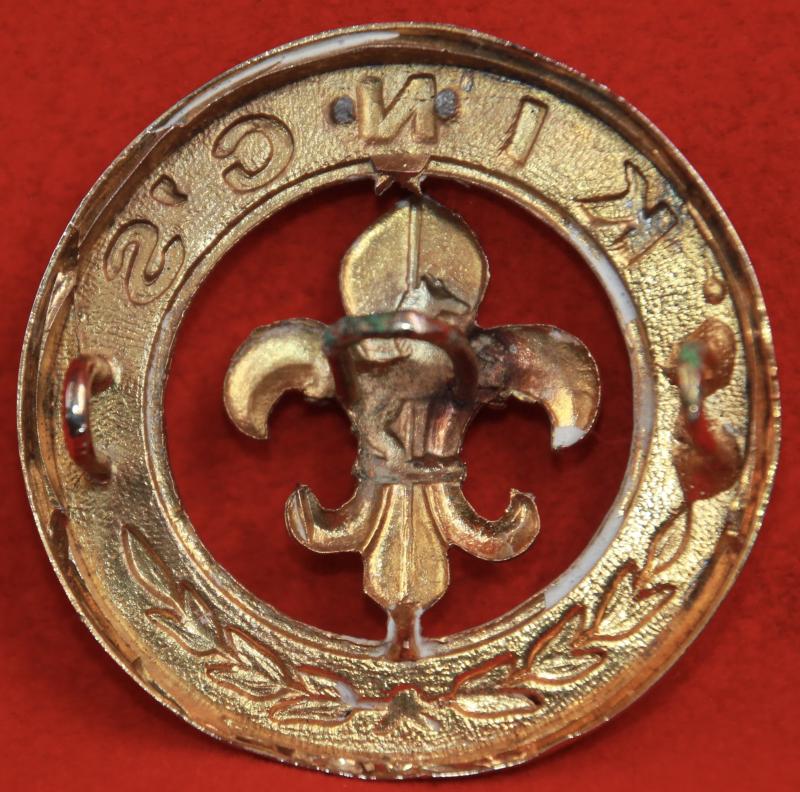 A bi-metal helmet plate centre for The King's Regiment (Liverpool & Manchester) with three staple-style loop fastenings (east, west and centre - perhaps a north loop is missing?).