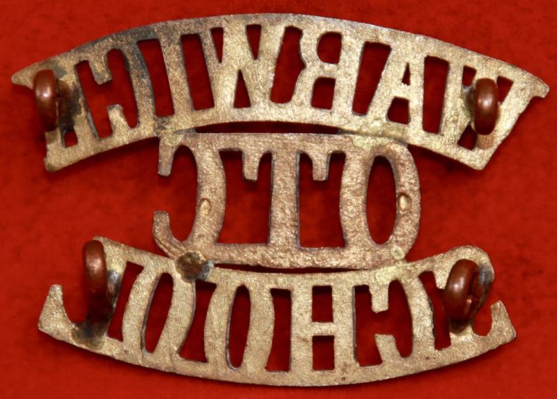 A brass shoulder title for The Warwick School Officer Training Corps with four lug fastenings. Rawlings 1760 or 2300.
