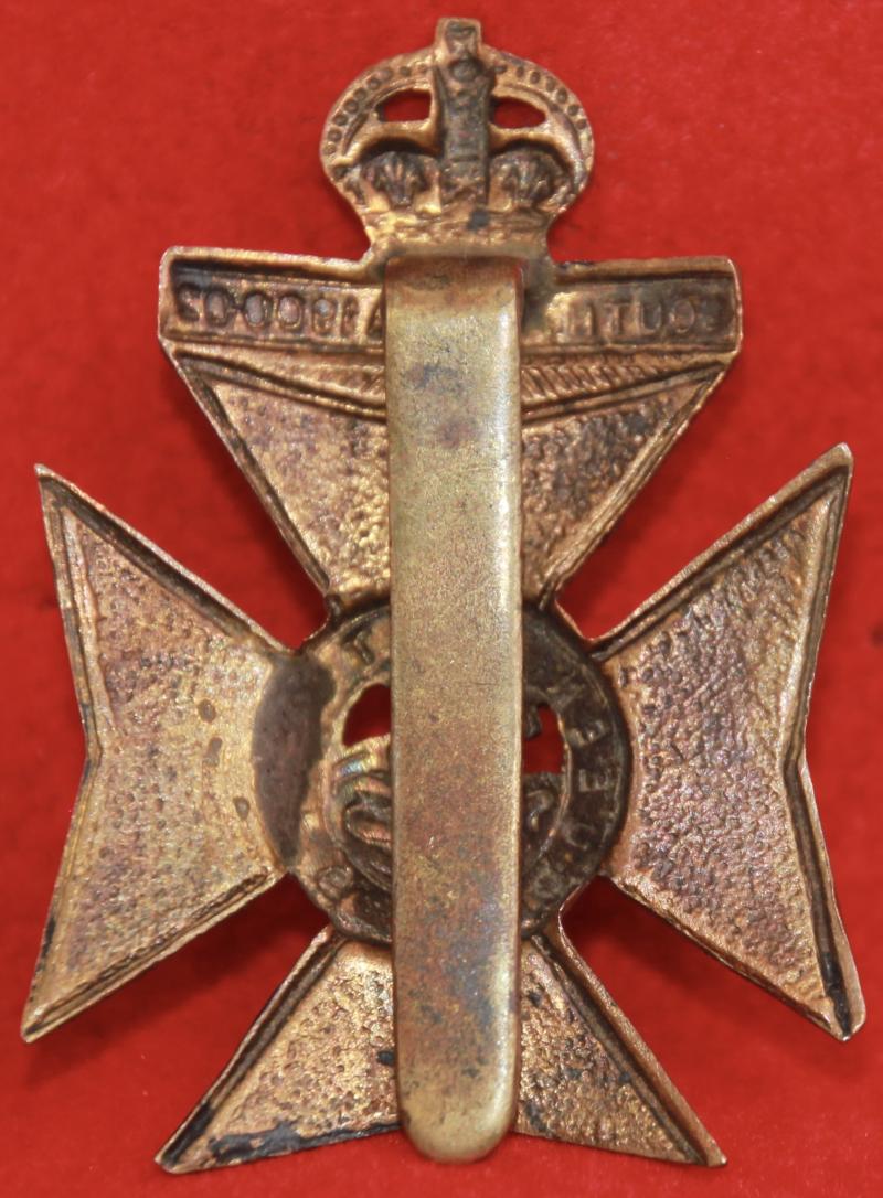 A (faded) blackened brass cap badge for the 9th battalion of The London Regiment (Queen Victoria's Rifles) with a slider fastening and an aged red felt backing. KK1828.