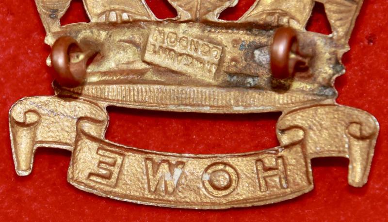 A nice, brass, cap badge for The Royal Naval Division, Howe Battalion, with two lug fastenings (east and west). The reverse bears a plaque for manufacturer J.R. Gaunt London. KK1164.