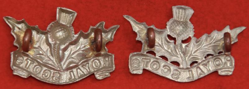 A non-matching pair of white metal collar badges for pipers of The Royal Scots (The Lothian Regiment), each with two lug fastenings (east and west). Churchill 4/5.