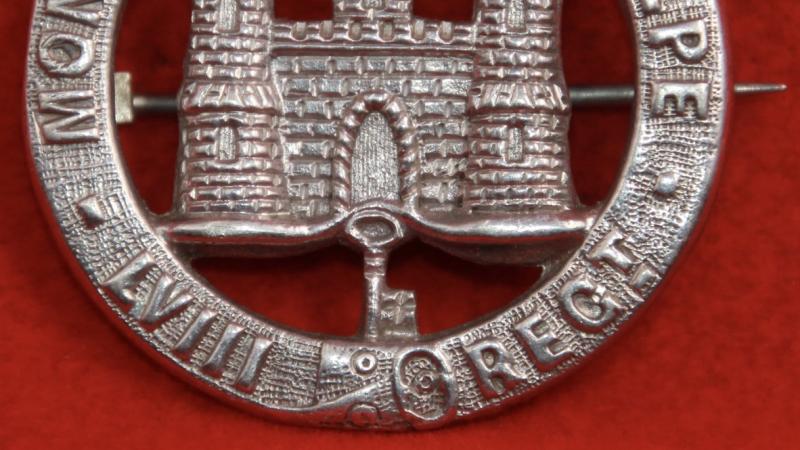 A rare, silver, puggaree badge for an officer of The 58th Foot with a pin fastening. Note: I believe the bottom part of the strap is missing - priced accordingly.