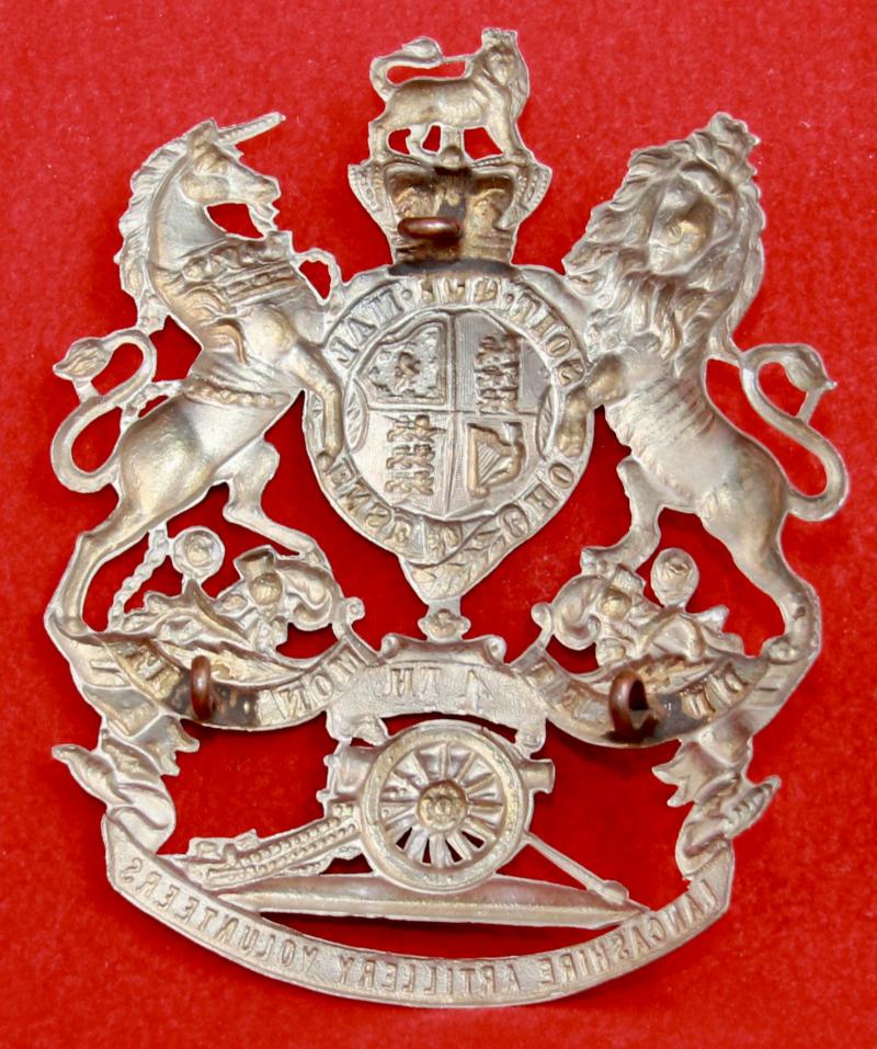 A white metal helmet plate for The 4th Lancashire Artillery Volunteers with three lug fastenings (north, east and west).