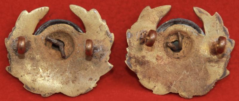 A pair of cast bi-metal collar badges for an officer of The Royal Marines, each with two lug fastenings (east and west). Churchill & Westlake 416.