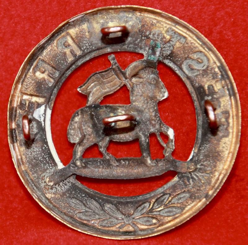 A bi-metal helmet plate centre for The Queen's (Royal West Surrey Regiment) with all four of its staple-style loops fastenings intact. KK293.