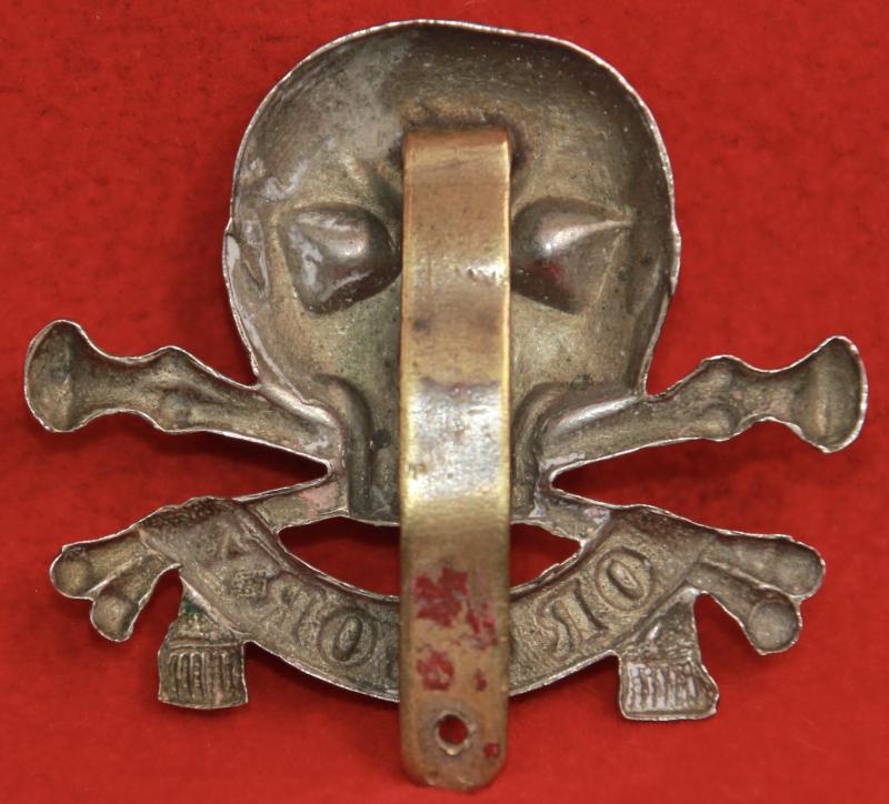 A white metal cap badge for The 17th/21st Lancers with a slider fastening. KK782. Note: The slider has a hole drilled through the bottom, presumably so it can be tied in place.