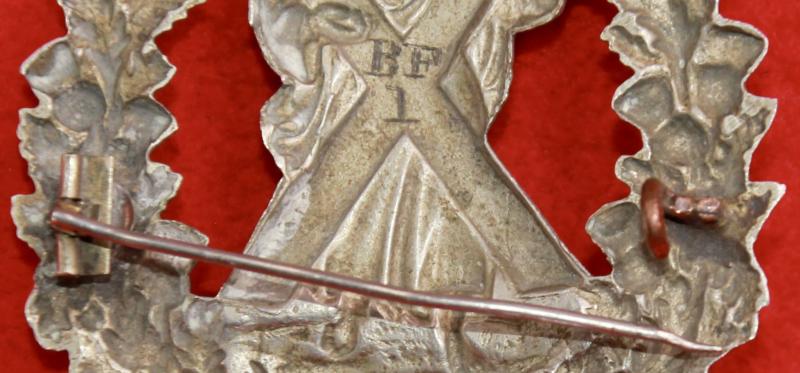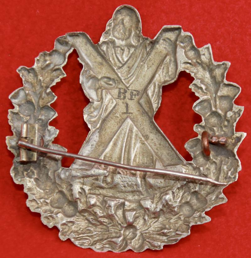 A scarce, white metal, early pattern glengarry badge for The Cameron Highlanders with a pin fastening (seemingly converted from lugs). KK548. Note: The reverse is stamped BF with 1 below.