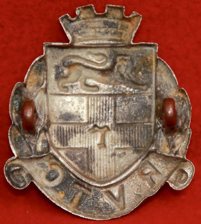 A scarce, white metal, cap badge for The Rochester Volunteer Training Corps with two lug fastenings (east and west). Slight polish. KK1630. Note: This unit was part of the WW! volunteer training corps movement.