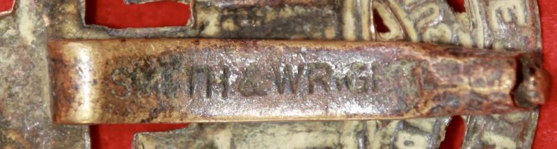 A WW1 economy issue, brass, cap badge for The Dorsetshire Regiment with a slider fastening (marked Smith & Wright Ld B'ham - partially obscured from twists/damage to the slider). Some polish. KK651.