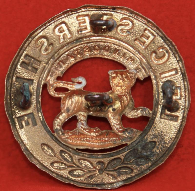 A brass helmet plate centre for The Leicestershire Regiment with all four of its staple-style loop fastenings intact. KK806.