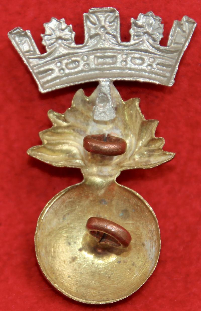A one-piece, bi-metal, cap badge for The Royal Irish Fusiliers with two lug fastenings (north and south). KK694.