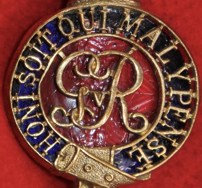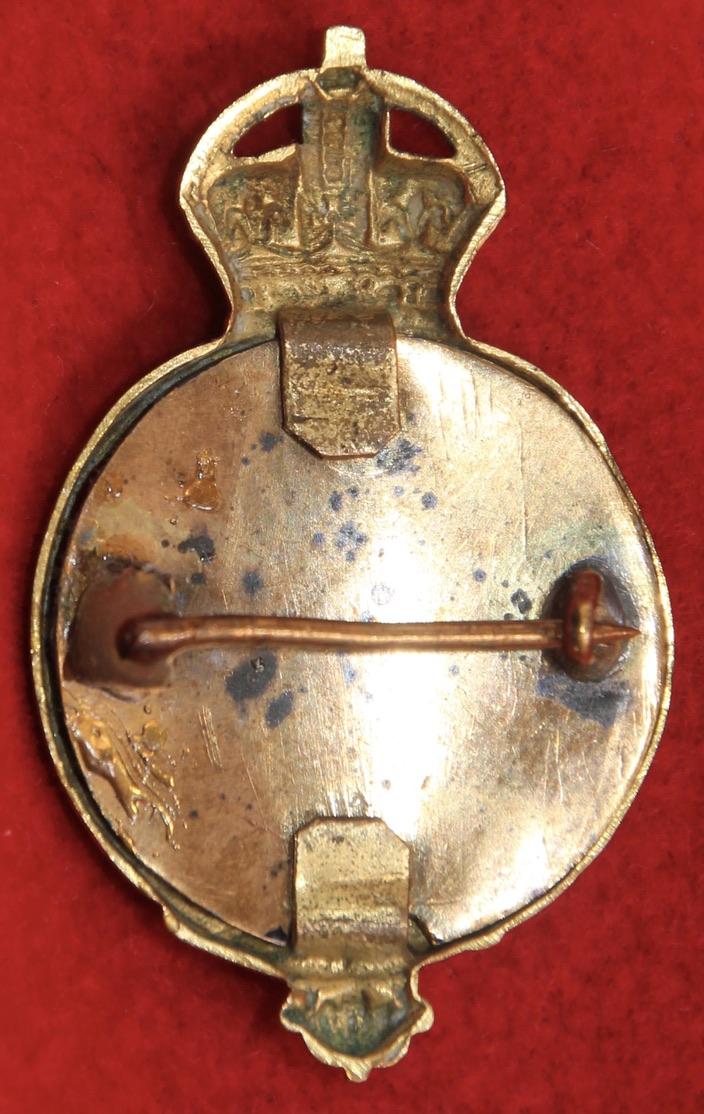 A rare, George 5th pattern, gilt and enamel cap badge for an officer of The Household Cavalry converted to a brooch with a pin fastening. KK1882. Note: The enamel looks slightly defective.