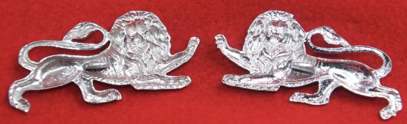 A pair of anodised aluminium collar badges for The King's Own (Royal Lancaster Regiment), each with a single central lug fastening. As Churchill 106/107. Note: These are the larger pattern collar badges.