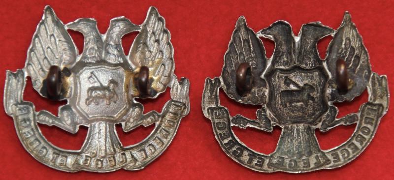 A (non-matching) pair of white metal collar badges for the 4th volunteer battalion of The Black Watch (Royal Highland Regiment), each with two lug fastenings (east and west). Churchill 1187.