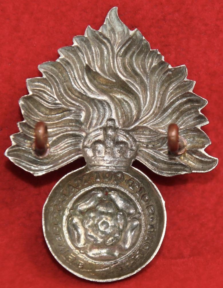 A white metal cap badge for a volunteer/militia battalion of The Royal Fusiliers (City of London Regiment) with two lug fastenings (east and west). KK596.