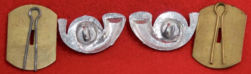 A pair of anodised aluminium collar badges for The King's Own Yorkshire Light Infantry, each with a single (central) lug fastening. The backplates and cotters pins are intact. Churchill 1395.