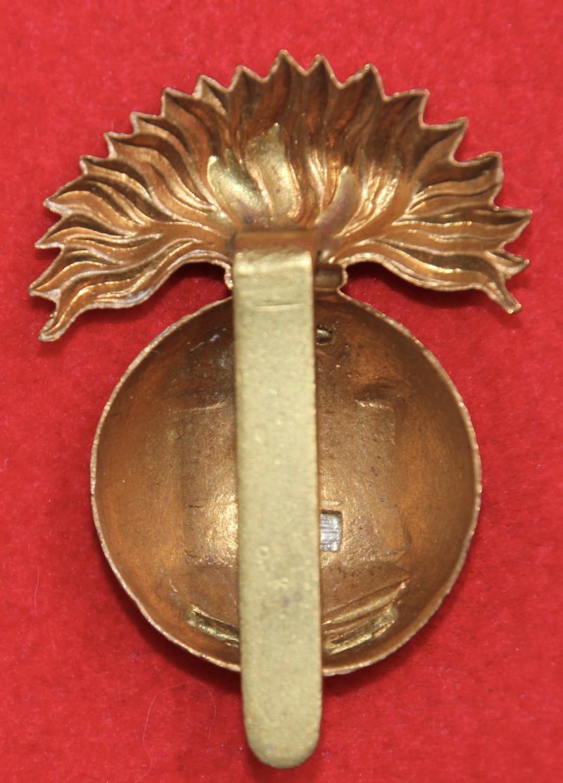 A bi-metal, flag left pattern, cap badge for The Royal Inniskilling Fusiliers with a slider fastening and 'sweathole' construction. KK632.