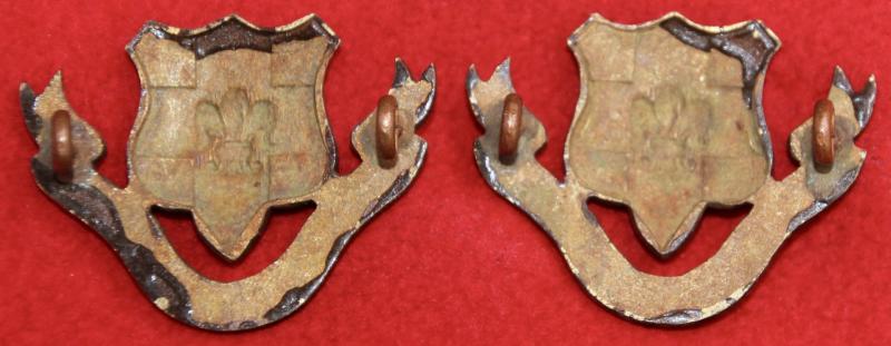 A pair of officer's service dress, bronzed, collar badges for The Loyal North Lancashire Regiment each with two lug fastenings (east and west). Churchill 1295.