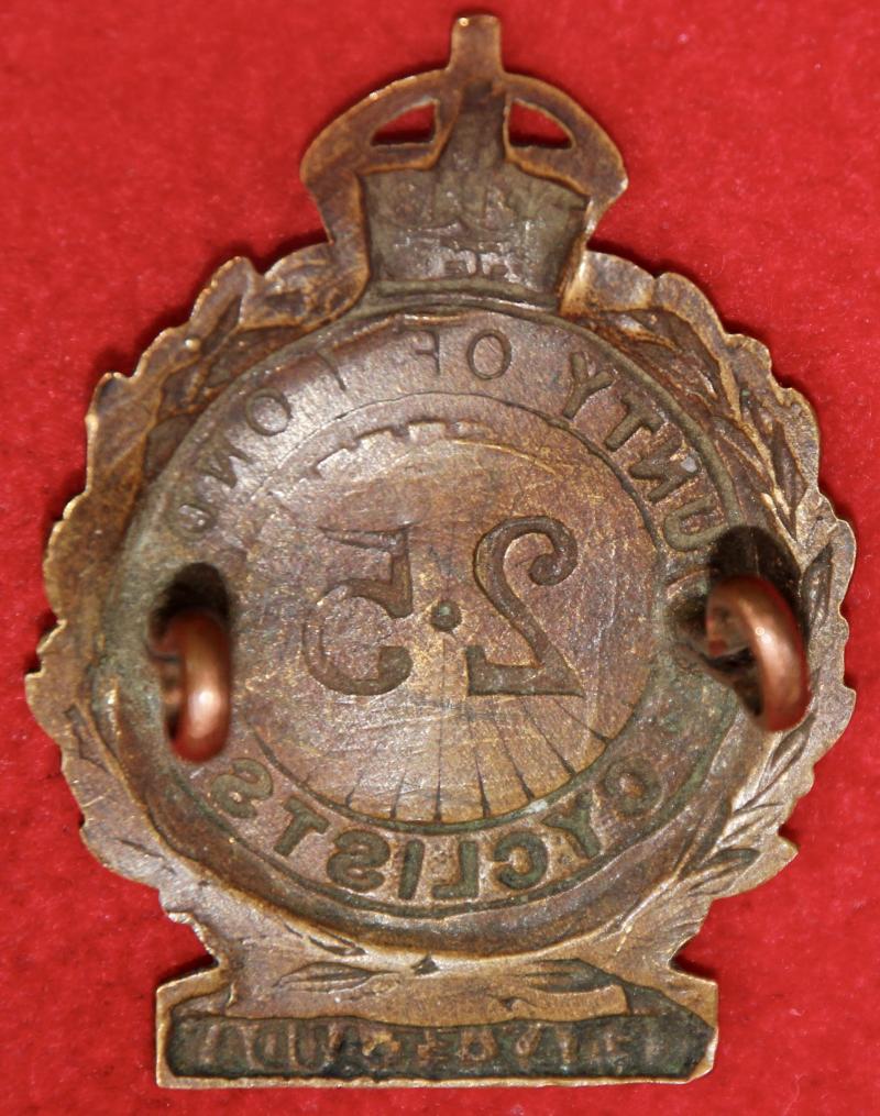 A nice, bronzed, cap badge for the 25th (cyclist) battalion of The London Regiment with two lug fastenings (east and west). KK1857.