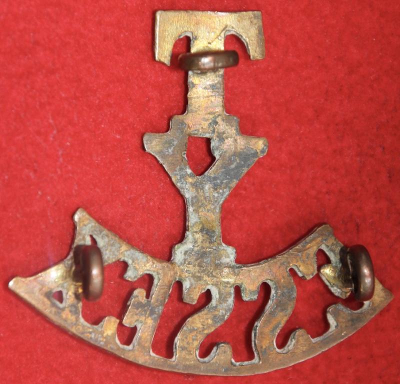 A brass shoulder title for The Essex Yeomanry with three lug fastenings (north, east and west). Westlake 348.