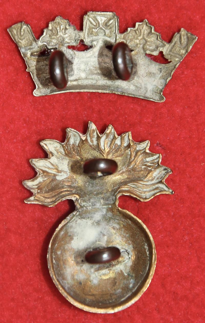A two-piece, bi-metal, cap badge for The Royal Irish Fusiliers with two lugs on the grenade (north and south) and two more lugs on the coronet (east and west). KK692.