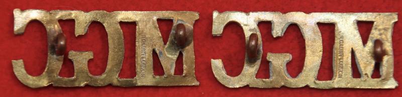 A pair of brass shoulder titles for The Machine Gun Corps, each with two lug fastenings (east and west - pinched). The reverse of each is marked for manufacturer J.R. Gaunt London. Westlake 381.