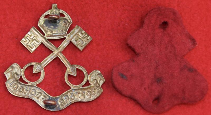 A brass cap badge for the St Peter's School (York) Combined Cadet Force with two lug fastenings (east and west) and a red felt backing . As KK2677.