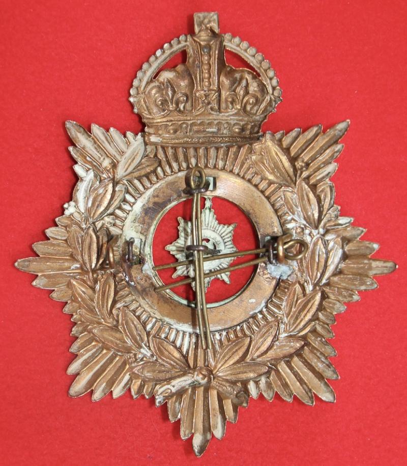 A brass helmet plate for The Worcestershire Regiment with two staple-style loop fastenings on the backplate and all four intact on the centre. KK358/385.