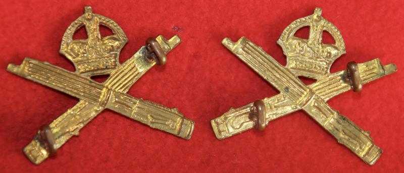 A pair of brass collar badges for The Machine Gun Corps, each with two lug fastenings (east and west - diagonal). Churchill & Westlake 391.
