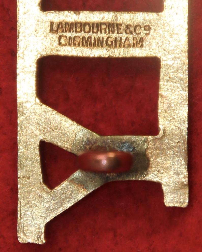 A scarce, brass, shoulder title for The Bedfordshire Imperial Yeomanry with two lug fastenings (east and west - likely replacements). The reverse is marked for manufacturer Lambourne & Co Birmingham. Westlake 347.