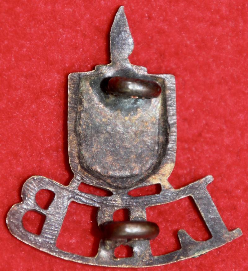 A blackened brass field-service cap badge for the 1st City of London Volunteer Rifle Brigade with two lug fastenings (north and south). Churchill 1933.