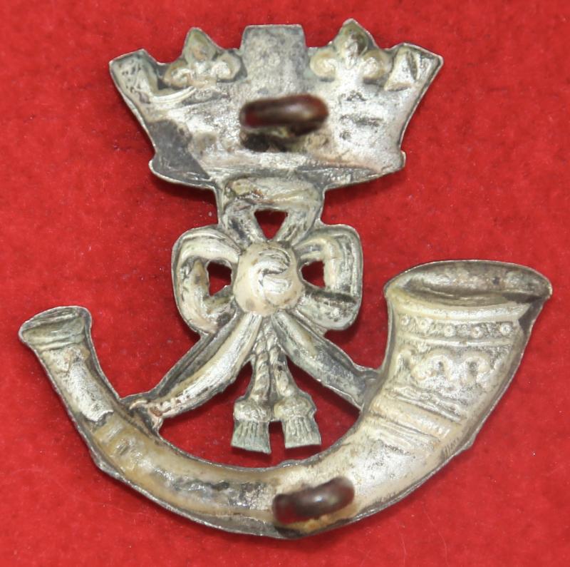 Note: Churchill states: "This battalion wore from c1895-1908 a white metal field service cap badge of a coronet over ribboned bugle horn. The badges occur in facing pairs, and are believed to have been worn as collar badges in South Africa 1899-1902."